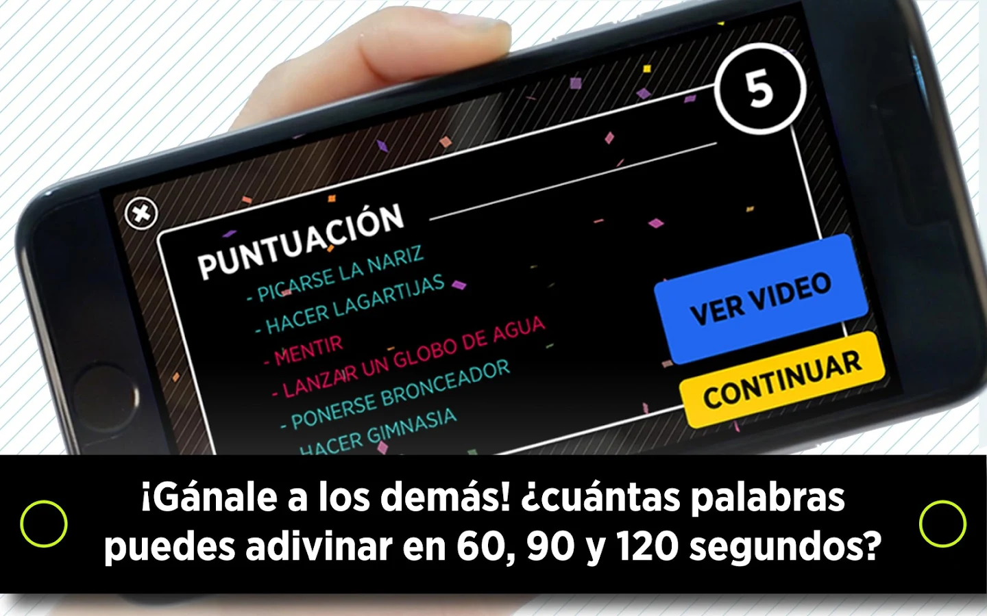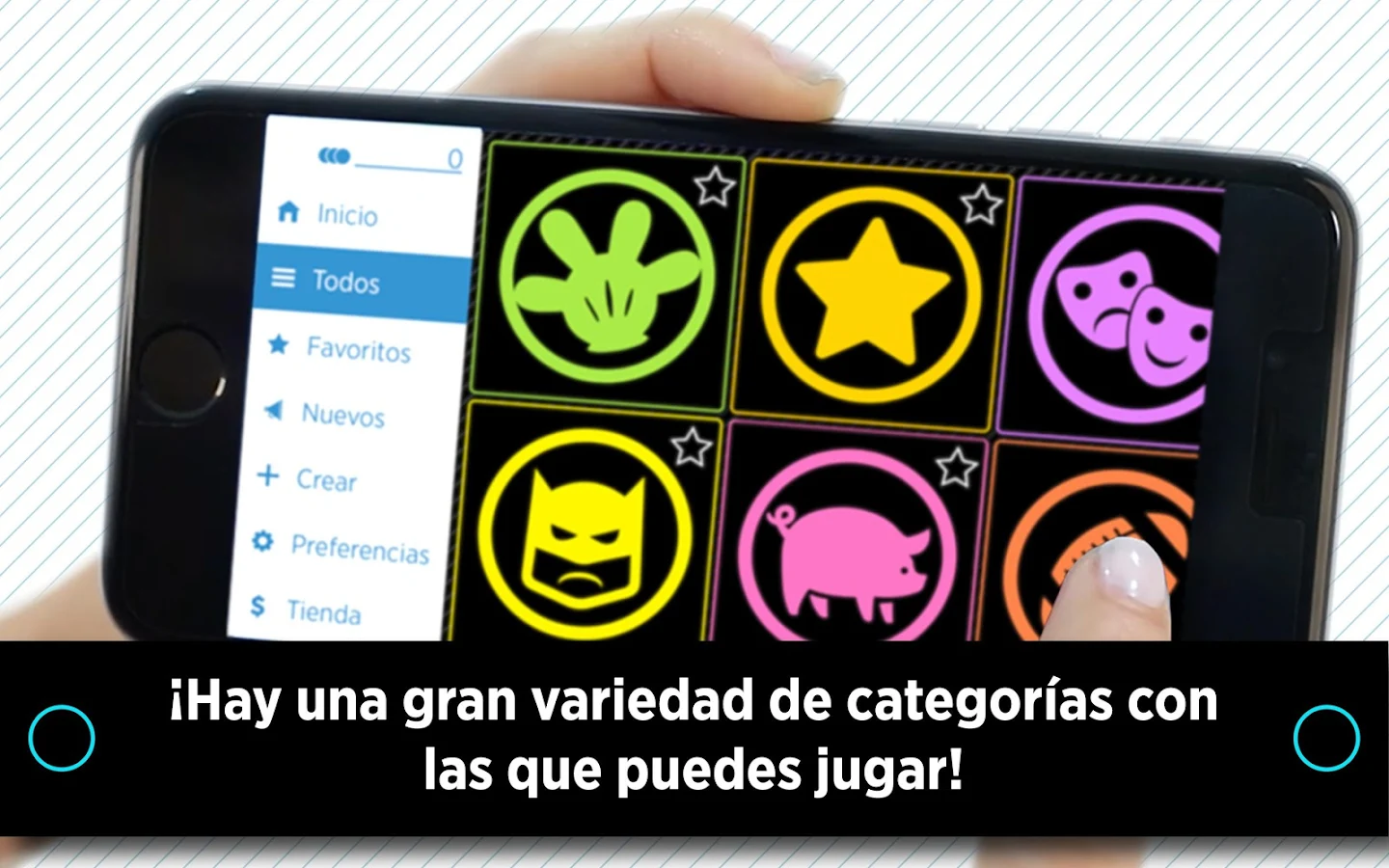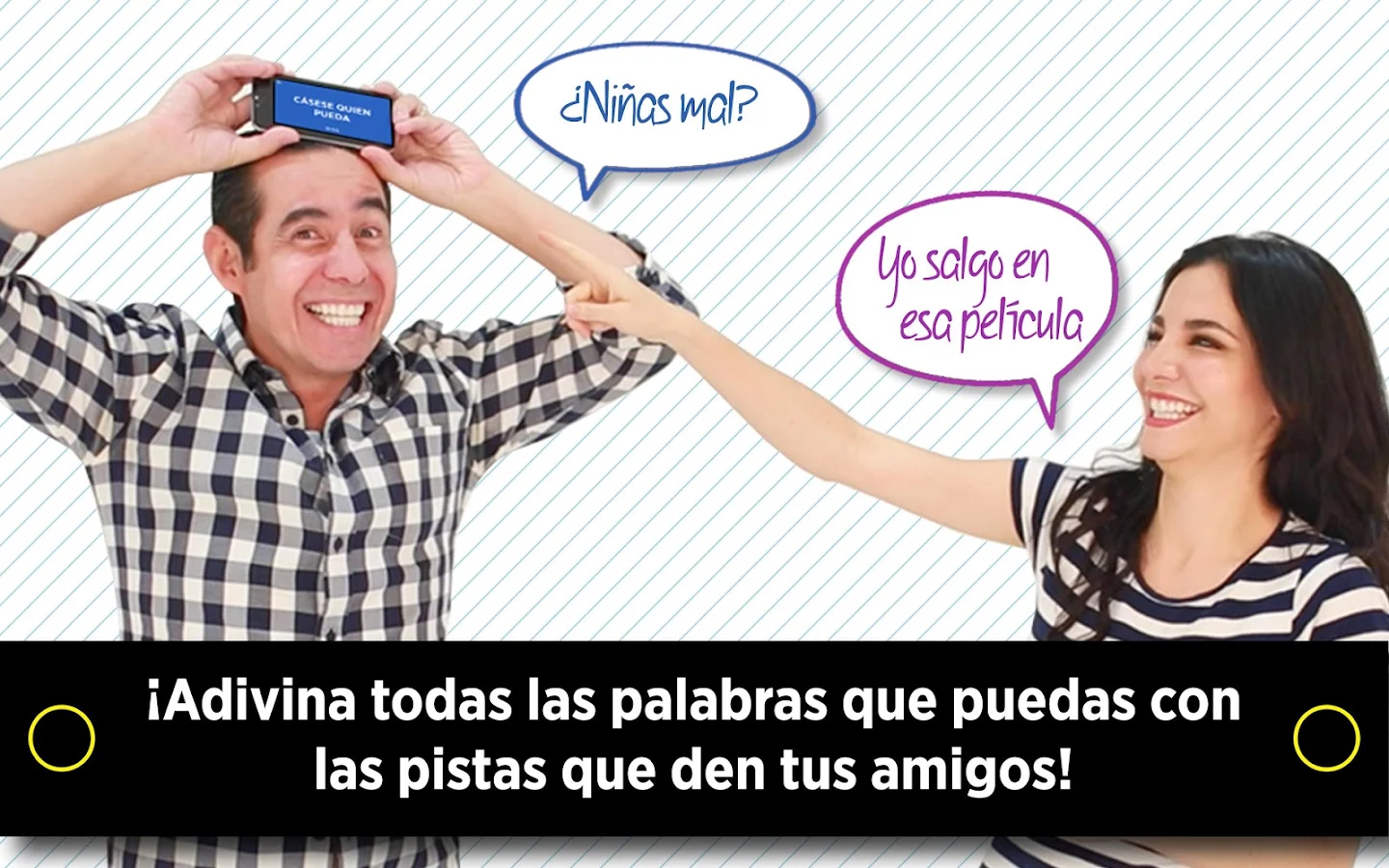 Adivina palabras desde nombres de famosos, personajes de caricaturas, videojuegos, películas, etc. También puedes adivinar cuando los demás imiten acentos y recreen acciones divertidas.