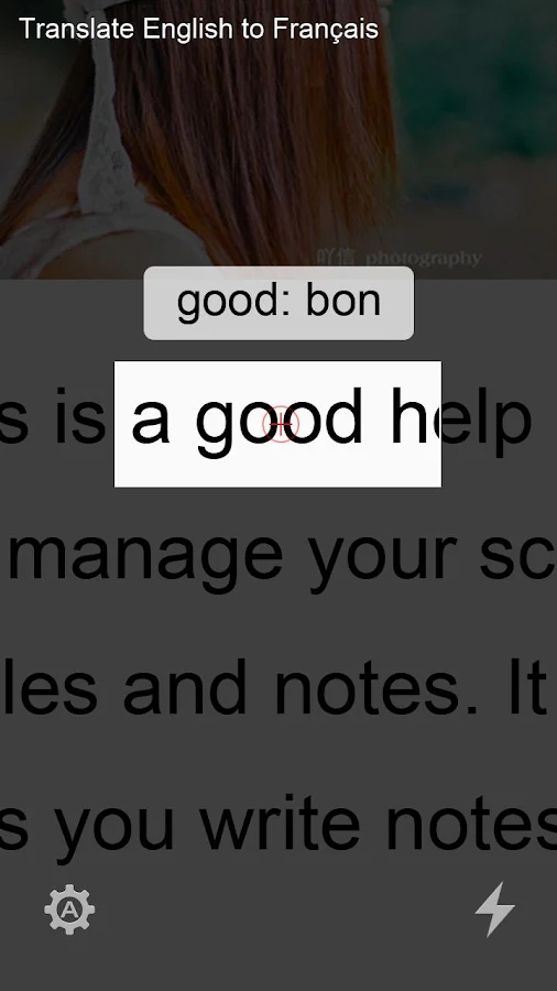 Extrae el texto palabra por la cámara del teléfono móvil y proporcionar servicios de traducción en línea. Basta con apuntar la cámara hacia la palabra , el resultado traducido instantáneamente mostrar en la pantalla.