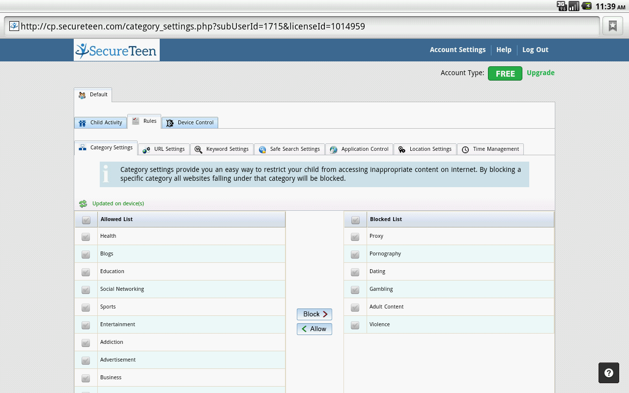 - Usar la mayoría de las categorías incorporadas en SecureTeen para bloquear contenidos inapropiados de la experiencia de internet de su hijo.
