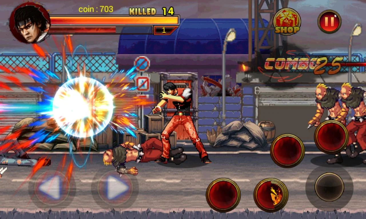Rey de kungfu: el combate de la calle - ayudar al héroe valiente limpiar la ciudad desde las bandas callejeras. Utilice las artes marciales para derrotar a una gran variedad de enemigos. El héroe de este juego para Android, un maestro de kung fu, se ve obligado a luchar por su vida en las calles de una gran metrópoli. Ayúdale a ganar peleas. Tenga cuidado y no permita que los enemigos se acercan. Los enemigos atacan desde todos los lados. Con el tiempo gire el héroe en la dirección correcta y el uso de diversas técnicas de lucha. Combos de gran alcance le ayudará a lidiar con multitudes de matones y jefes de gran alcance. Características del juego: