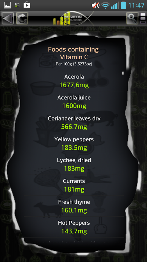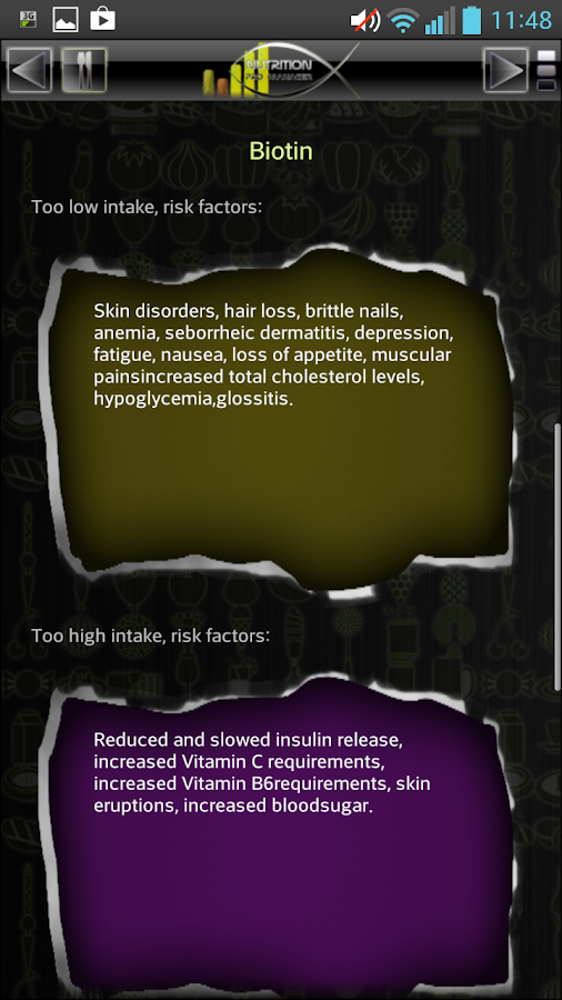 ✓ Access to a detailed encyclopedic reference about the main nutrients of the human diet, clicking the menu button of your device, you can choose to show the nutrients by category. For every nutrient is shown also the risk of low intake and\or overdose, and are listed the interactions with others elements that can influence the needed amount due to synergistic or antagonist effect.